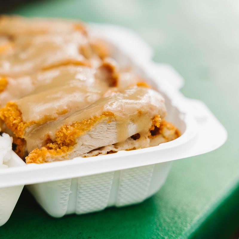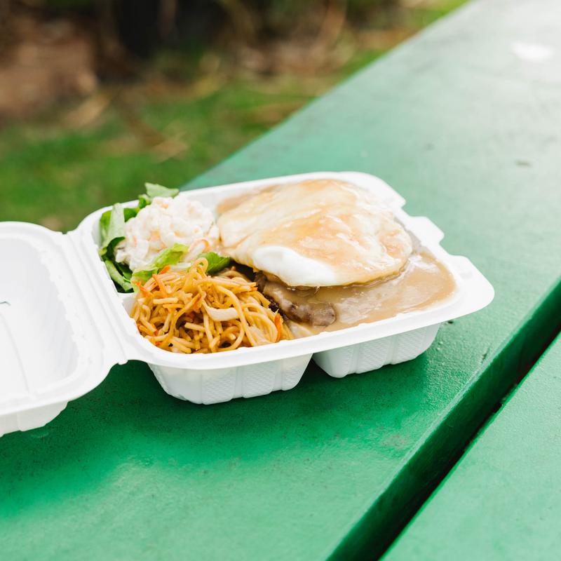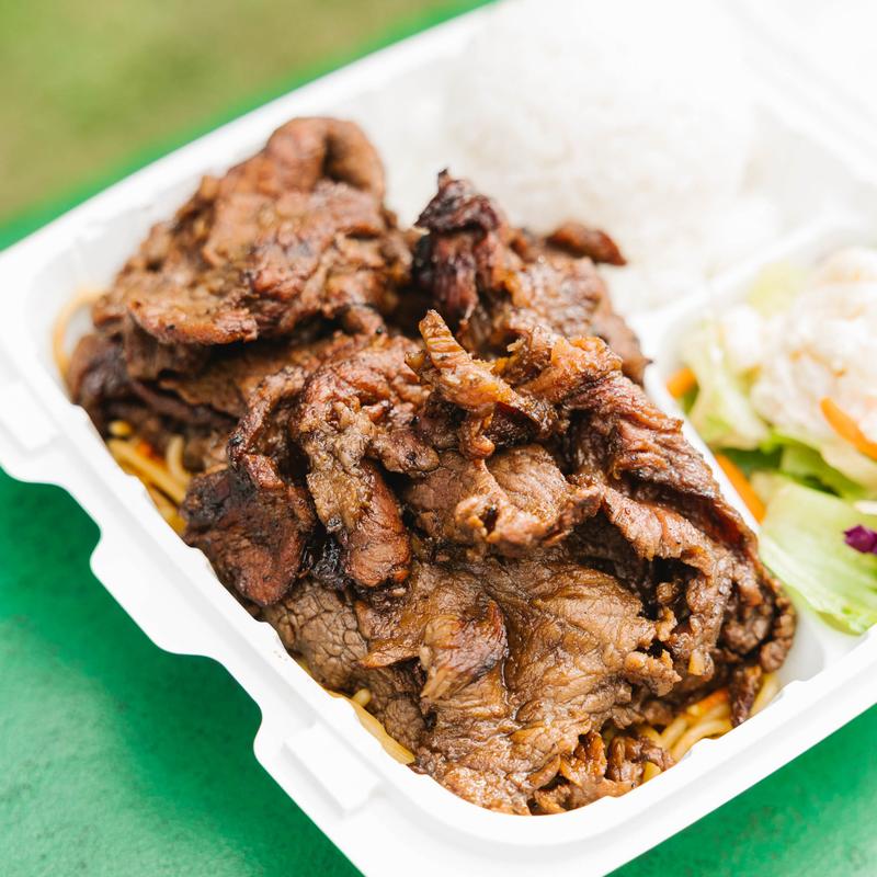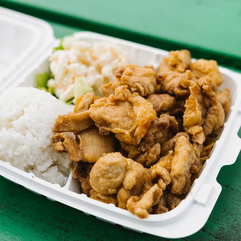 Chicken katsu, teriyaki beef, & beef stew, along with rice and potato macaroni salad.
